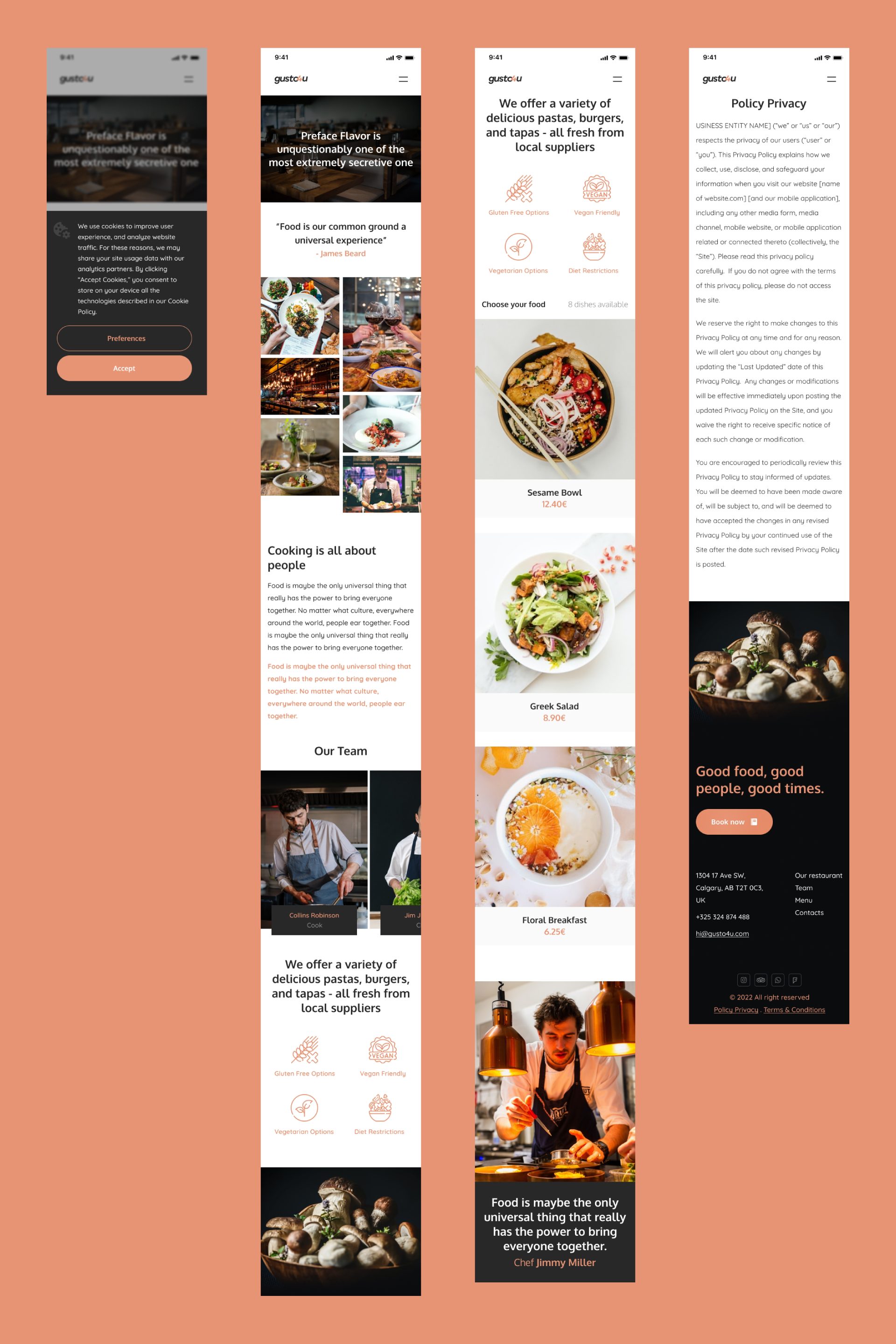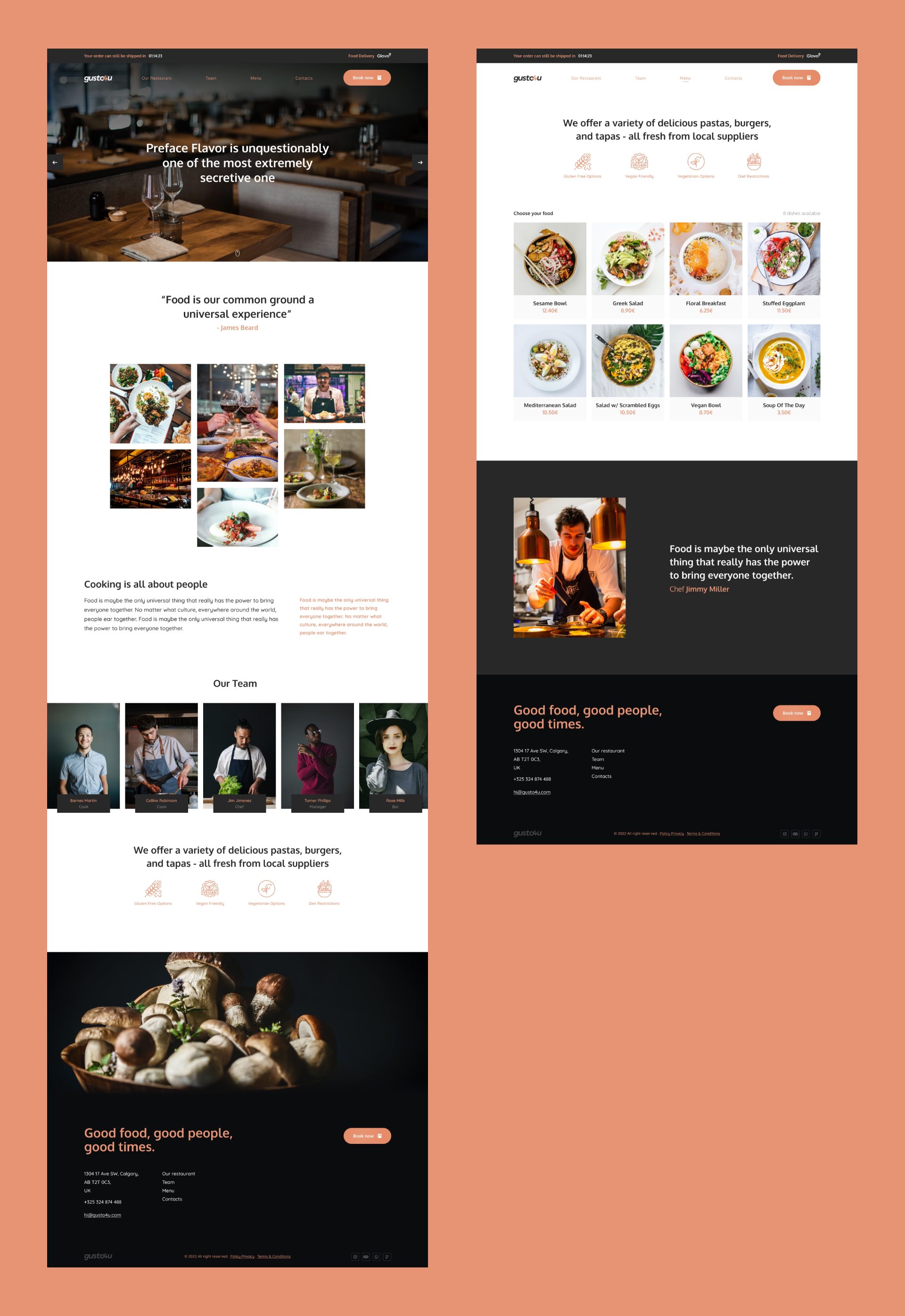 Restaurant website é um projeto pessoal. Este website foi desenvolvido no Figma e está focado para restaurantes, pubs e bares. É uma landing page com um design limpo e responsivo.